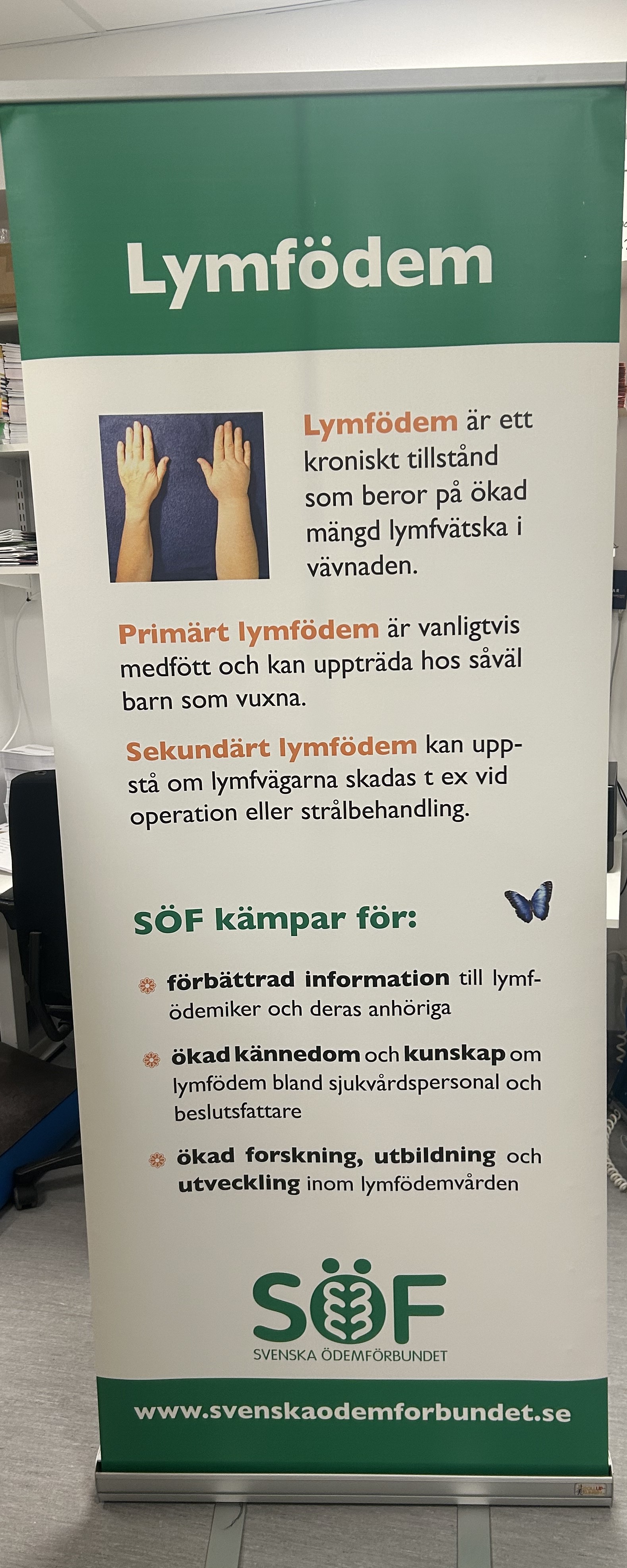 3 banderoller, "Lymfo-Logiskt Tänkande vid egenvård...", "SÖF vill se rättvis och jämlikvård..." och "Manifesto, Världsdagen för lymfödem 6 mars 2023"