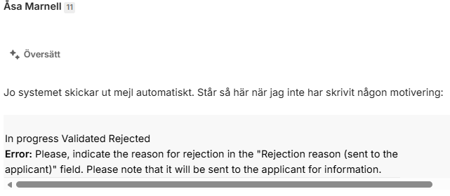 Enl Åsa så mejlas det ut ett meddelande till medlemmen när man sätter någon som avvisad: