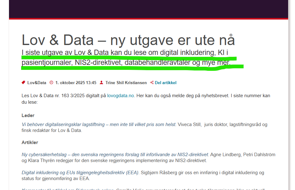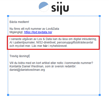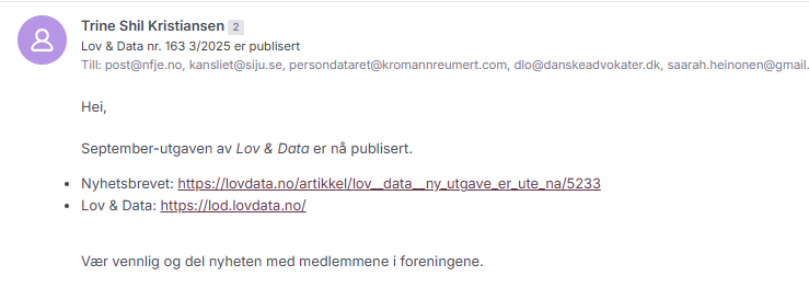 Email kommer från tsk@lovdata.no när ett nytt nummer av tidningen Lov&Data är ute. I emailet finns en länk till nyhetsbrevet, tryck på länken och kopiera den del av text som är grönmarkerad, översätt texten till svenska och lägg in den i själva emailet till medlemmarna.